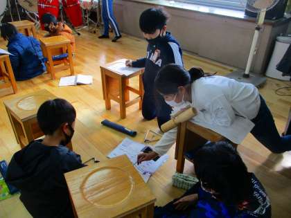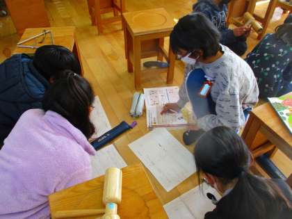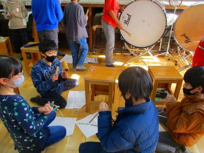 音楽の学習で,音の特徴を生かして音楽づくりをしています。グループで楽器を選び,どのように演奏するとよいか話し合って,音楽を作ります。強弱や楽器の重なりを考えました。