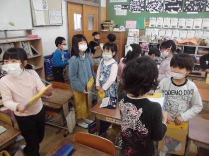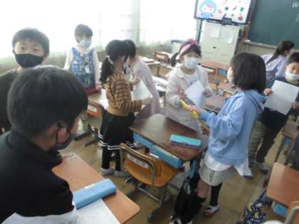 英語活動「サラダで元気に」の学習でWhat's vegetable do you like?を使って,友達の好きな野菜調べをしました。