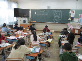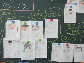 生活科の学習では,「みんなのにこにこ大さくせん」の学習をしています。そこで,自分たちは,どんな時ににこにこするのかを考えました。プリントに自分の笑顔の絵と,どんな時ににこにこするのかをかきました。「給食を食べている時。」「お友達と遊んでいる時。」「先生にほめられた時。」「お家の人とお出かけに行く時。」。など,たくさんのにこにこを見つけることができました。みんなで交流して,たくさんのにこにこを出し合うことができました。