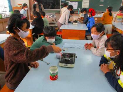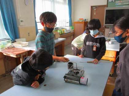 理科で様々なものを熱する実験をしています。今日は金属を熱するとどうなるか実験をしました。熱したあとに輪に通してみて,どうなっているのか確かめました。熱すると輪に通らなくなる結果から,それはつまりどういうことなのか考えました。