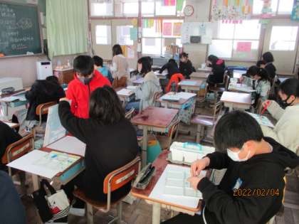 一枚の板から素敵な作品が生まれます。次の時間は,黒のインクで印刷する前に,絵の具で少し色付けをしました。水をたっぷり含ませて,淡い色で和紙をほんの少し色づけました。きれいだね。