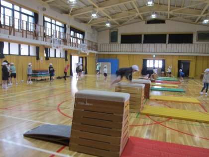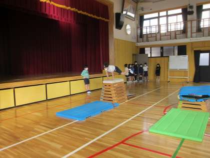 とび箱の学習が始まりました。3年生は開脚とび・かかえこみとび・台上前転に取り組みます。今日は,ふみ切りの仕方に気をつけながら活動しました。「ふみ切る前は,かた足に力を入れること」,「ロイター板が大きく音を出すように両足でふみ切ること」が大事だと考えてそれぞれのめあてにあわせて取り組みました。初めて,開脚とびや,かかえこみとびができた人もいて,大きな拍手がわき起こっていました。