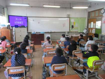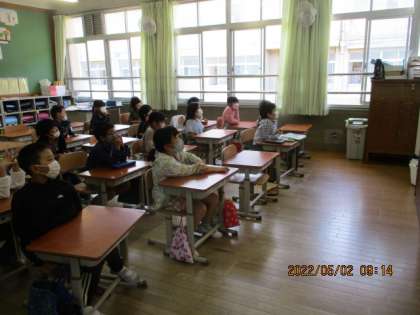 2年生になってはじめての全校集会です。今日の全校集会は,5月3日の「憲法記念日」に合わせて行うものです。人権という言葉は2年生にとってとても難しい言葉ではありますが,自分も友達も大切に思う気持ちや行動のことでありますから,いろいろな場で「人権」について思い考え,行動できる人であってほしいです。オンラインではありましたが,校長先生のお話をきちんと聞きました。また,「つくし学級のお友達のことを知ろう」ということで,紹介動画も見ました。つくし学級のお友達の中で,2年生のお友達がうつると,とてもうれしそうに拍手をしていた子どもたちです。みんなで仲良くしましょうね!