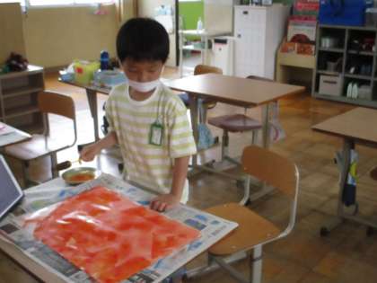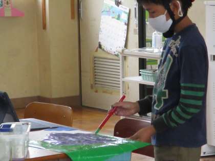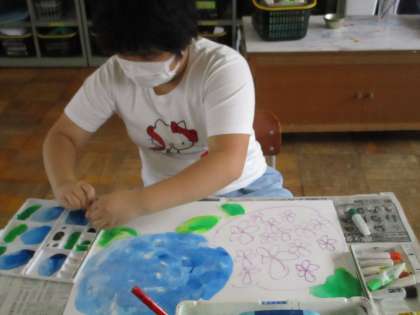 図画工作の時間に季節の花を描こうということで,あじさいの花を描きました。絵の具を使って,あじさいの花のきれいな色を表現していました。