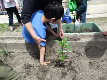 生活単元で学級園に野菜の苗を植えました。立派な野菜に育つように,毎日のお世話をがんばっていきたいと思います。