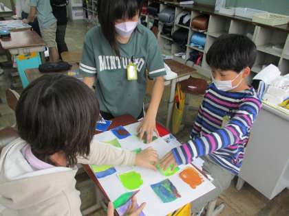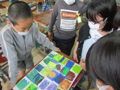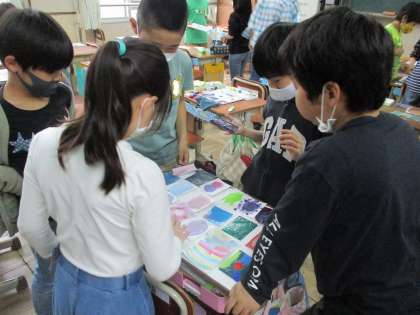 一人で模様を作ったあとは,班ごとに作品を白い画用紙に並べました。そして,いろいろな班の模様を見ながら,いいところやイメージできるものを友達と話し合いました。