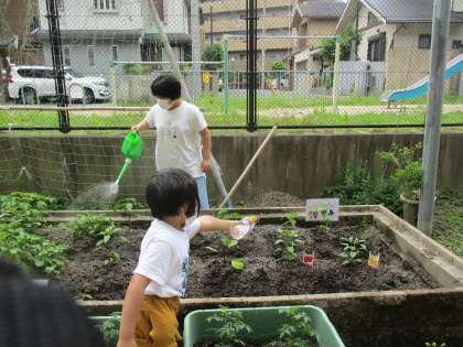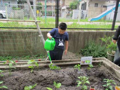 野菜に水やりをしました。週末の間に,大きくなったような気がして,みんなで喜びました。ミニトマトには,小さな緑の実もできていました。今週も,お世話をがんばりたいと思います。