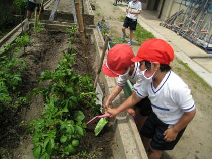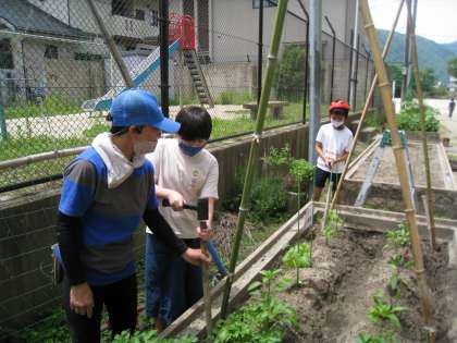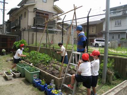 今日は,つる科の野菜のために,管理用務員さんのご協力のもと,支柱を立ててネットを張りました。本格的なものが完成し,みんな「すごい!すごい!」と大喜びでした。