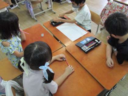 学活の時間に,もっと一年生と仲良くなるためにどんなことをしていくかを考えました。今日は,一年生に学校にある音楽室や職員室など,普段授業をしている教室以外の部屋を紹介するカードを作りました。一年生にもわかるように絵などを使って分かりやすい紹介カードを作っていました。