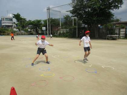 1年生に5年生の児童が伴走し,励ましながら丁寧に教えていました。1年生も最後までがんばって走り切っていました。天気もよく,体を動かした後は,みんな大量に水分補給をしていました。