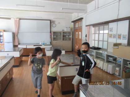 1年生を学校探検に誘っています。教室のポスターを作るために,グループごとに下見に行きました。事務室や家庭科室にも行きました。たくさんの道具がありましたね