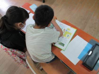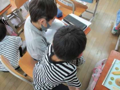 生活の「ぐんぐんそだておいしいやさい」では,自分が育てる野菜の育て方を本を見ながら調べました。水をあげるのはどのくらいの頻度でするのか,収穫の時期などを調べていました。