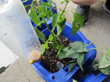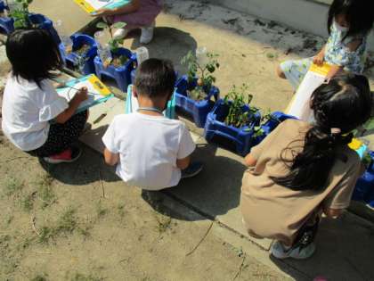 生活の授業では,自分の育てたい野菜を決め元気に大きく育つように,水をあげたり,観察をしています。育ててからまだ少ししかたっていませんが,ピーマンに実がなっていました。これからどのように野菜が成長するか楽しみです。