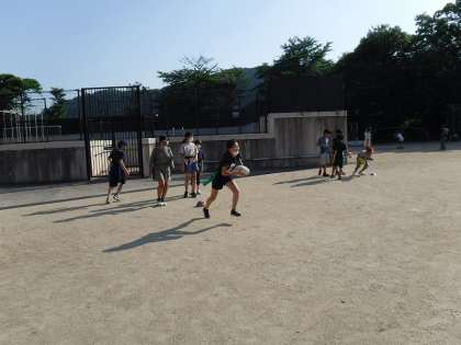 11日(土)にタグラグビー選手権大会があります。4〜6年生の有志のメンバーで集まり,出場します。放課後にみんなでボールの持ち方や走り方,ルールなどを教えてもらって,練習をしています。