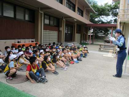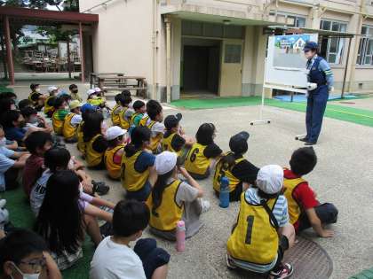 今日は午後から右京警察署の方と嵐山交通安全推進会のみなさんに来ていただき,自転車安全教室を行いました。まずは警察官の方に自転車の交通マナーについて教えていただきました。