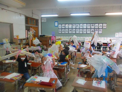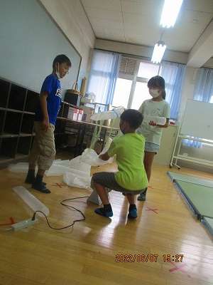 ふくろに空気を入れて,風にのせたらうき上がったり落ちてきたりする楽しいものを工夫して作りました。