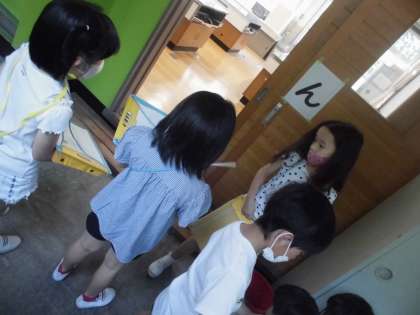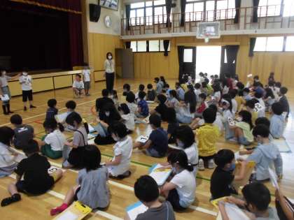 初めは体育館で初めて顔を合わせ,お互い緊張した様子で自己紹介をしました。その後,校内の様々な教室をめぐり,キーワードを集めていきます。全部回って,お別れするときにはすっかり打ち解けて,仲良くなることができました。