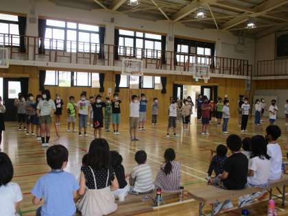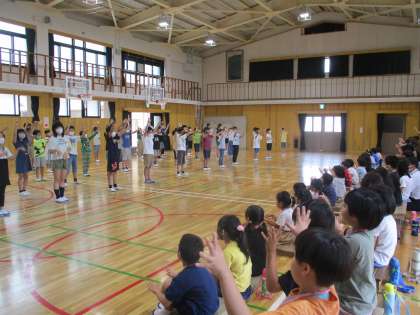 今日の3校時は1年生を迎える会でした。4年生は昨日まで練習していた「グー・チョキ・パー」の手遊び歌をしました。緊張したようでしたが,一生懸命歌って踊っていました。1年生も一緒にやりながら楽しんでくれているようでした。