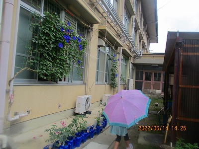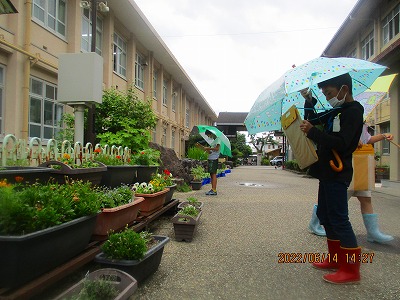 図工の学習で絵をかくために,「6月をかんじるもの」を探しに行きました。水たまりに雨が落ちる音や様子,中庭の池で葉っぱに隠れて雨宿りをしているようなトンボ,雨にぬれる小さな草花や季節の花たち。学校のあちこちで,たくさんの6月を見つけていました。