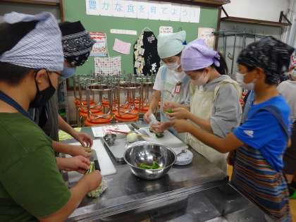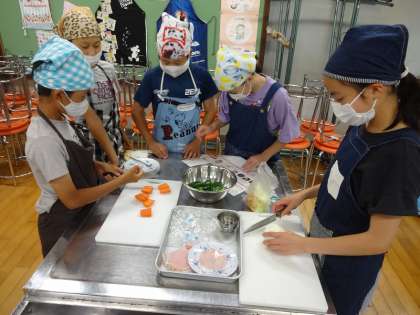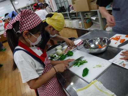 班の中で,調理器具の準備,野菜を切る等役割分担をして行いました。てきぱきと声を掛け合って進めていくのが,さすが6年生でした。野菜の切り方も確かめながら丁寧に切っていました。