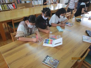 あじさい読書週間に図書委員さんが企画してたしおり作りがありました。子ども達は,図書委員さんが作ってくれたイラストに好きな色を塗ってしおりを作っていました。完成したしおりは,ラミネートをして,リボンをつけて完成です。世界に1つしかない,素敵なしおりを作ることが出来ました。