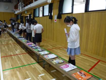 選書会がありました。6年生がトップバッターでしおりを挟みました。好きな本のシリーズなども置いてあり,嬉しそうにたくさんの本を選んでいました。これからもたくさんの本に出合ってくださいね♪