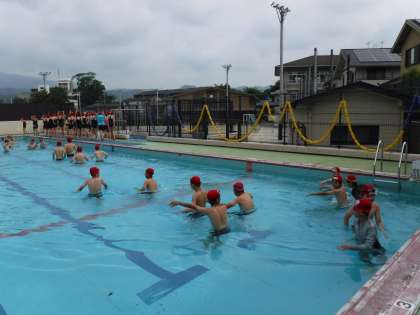 6年生も水泳学習が始まりました。今年度最初の学習だったので,準備運動や水慣れの仕方,学習の進め方などを確かめながら行いました。