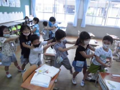 お話に合わせて動きを入れたり,台詞を入れたりして,登場人物の様子が分かるよう工夫して進める様子が見られます。