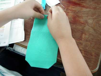家庭科の学習では、玉どめ・玉むすび、縫い方やボタンの付け方などを一通り練習しました。今日からは、小さいポーチを作っています。ポーチに蓋をする部分は、自分たちの好きな形に切っています。今日は。ポーチん形を決め、ボタンを留める作業をしていきました。少しずつ完成を目指していきます。