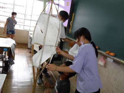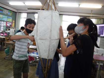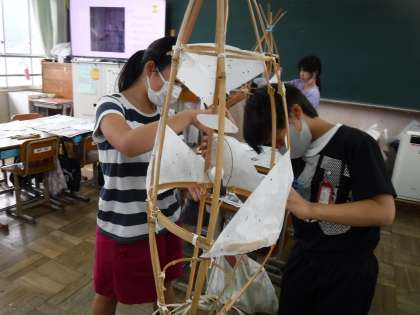 工程2つ目では、竹だけになった行灯に白和紙を貼って、土台作りをしました。和紙がピンときれいに張るように三角形の和紙を貼っていきました。とても難しそうでしたが、班で協力してきれいに貼ることができました!