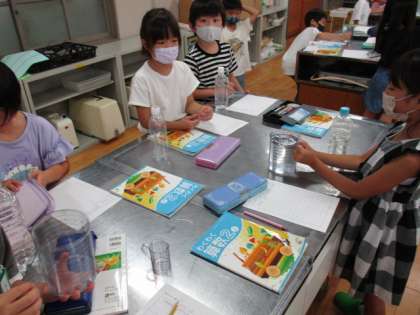 算数「かさ」では、ペットボトルや牛乳パックなどに、水がどれくらい入るかを水をいれて測る学習をしていました。ちょうど1Lのかさが入るものなどを、見つけている子どもなどもいました。