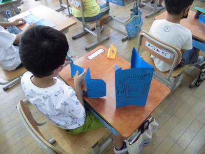 図画工作科「おってたてたら」の学習では、平面の画用紙を折って立てることができることを活かして、自分が思いついた世界を作りました。