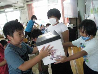 プレゼント渡しでは,みんなのお手製プレゼントや手紙がたくさん入ったオリジナルボックスを受け取っていました。3名とも,受け取るときの表情や様子に,うれしさがにじみ出ていました。