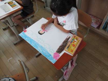 今日は毎日の生活の中で感じた、ドキドキワクワクしたことや楽しかったこと、頑張ったことを絵にかきました。夏休みにしたことや学校の中での出来事など、いろいろな絵がみられました。