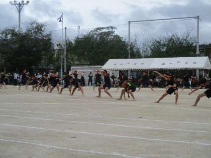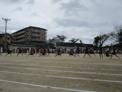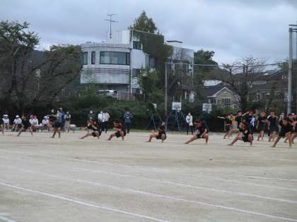 次に、隊形移動をしました。線を引いていなくても自分たちで上手に間隔をとって並べました。ソーラン節もクライマックスです。疲れてきてもしっかり腰を落として声を出して踊っていました。最後まで全力で踊る姿がとてもかっこよく、見ている人に感動を与えていました。