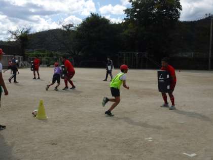 コンタクト体験もありました。タックルバックに思い切って体当たりをしました。はじめに、けがをしないように気を付けるポイントを教えていただき、思い切って体当たりをしました。