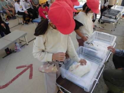 動物園を回った後は動物のふれあい体験を行いました。まずは説明を受けて、その後に実際に動物にふれあいました。2つの動物の触り心地の違いを感じていました。