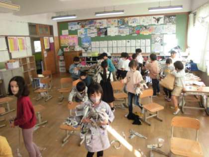 今日の図工は新聞紙などをつないで、いろいろな形を作る学習をしました。友達と協力してたくさん紙をつないで、楽しむ様子がよく見られました。片付けも協力して、授業を始めるよりもきれいにすることができました。