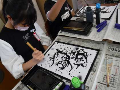 図画工作で墨と水を使ってできる形や色の面白さを感じました。社会科で学習した、水墨画を思い出しながら、自分の思うままに筆を動かし、作品を仕上げました。みんな、とても楽しく取り組んでいました。