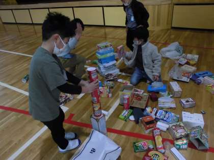 みんな広い体育館を目一杯使って、教室ではできないような大きな作品を作って楽しむことができました。