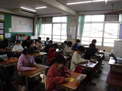 体験授業は、1組は数学、2組は国語の体験をしました。数学では、タングラムをしました。パズルゲームのような感覚で、子ども達の緊張もだんだんとほぐれ、楽しく活動していました。