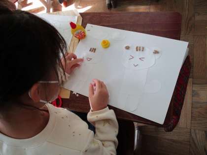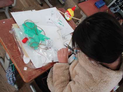 図画工作科「いろいろうつして」の学習で版画を作っています。自分の作りたいものに合わせて、画用紙や紙バンド、アルミホイルなど材料を選び、版を作っています。