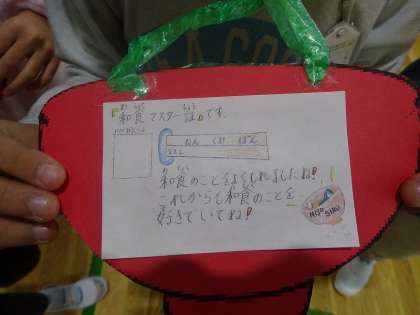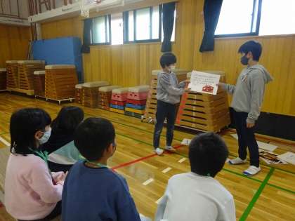 5年生が総合的な学習の時間で作った「わしょクイズ」を発表してくれました。グループごとにクイズコーナーを回り、最後に『和食マスター証』を受け取りました。楽しく和食について学ぶことができました。5年生、ありがとうございました。