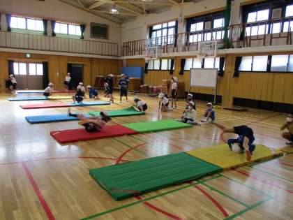 体育科の学習で「マット運動」をしています。ねらい1では、連続してきれいに・まっすぐ・スムーズにすることを意識しています。ねらい2では、少し難しいに挑戦しています。お友達とアドバイスし合って、きれいに・まっすぐ・スムーズに技ができるようになってきました。
