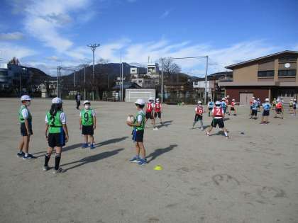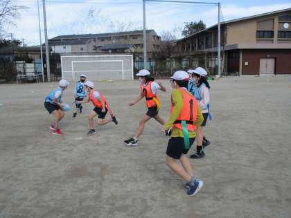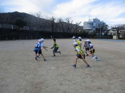 体育科の「タグラグビー」の学習では、はじめにウォーミングアップとして、チームでパスの練習をしたあと、試合を行いました。うまくいかないこともあったけれど、だんだんと慣れてきて盛り上がっていました。攻めるときと守るときに大切なことに気付いたチームもありました。子どもたちも、タグラグビーが楽しみな様子です。