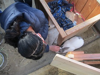 ウサギ小屋に入り、エサやり体験もさせてもらいました。逃げて、なかなか触れせてもらえない時もありましたが、しらたまちゃんに癒される時間でした。
