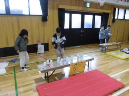 今日は生活科で作った手作りおもちゃをお店にして、クラスの友達にゲームで遊んでもらいました。まずは、友達に遊んでもらえるように準備をします。