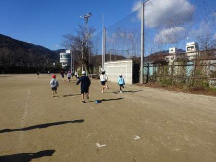 体育科の学習「ゆっくりペース」で150メートルのトラック使って持久走をしました。1月の校内持久走記録会では8分間走り続けますが、今日は5分間走ってみました。とても寒い中でしたが、止まったり、歩いたりせず、一所懸命走っていました。