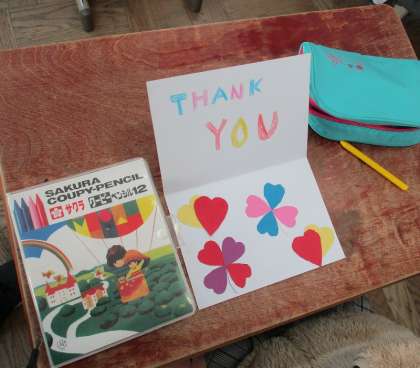 外国語活動の時間に、いろいろな色や形を組み合わせてカードを作りました。色や形を伝えることも上手になり、アンディー先生の「What do you want?」の質問に元気な声で答え、様々な形を手に入れていました。誕生日カードやクリスマスカード、サンキューカードなど渡したい相手を想像しながら素敵なカードができていました。