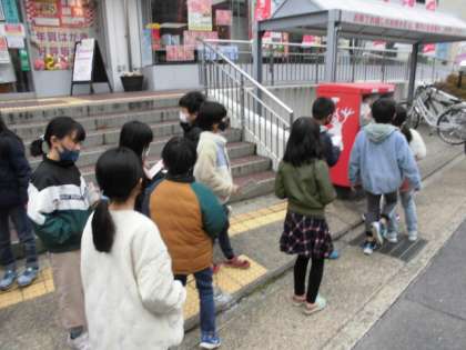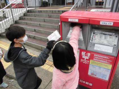 書写の時間に書いた、地域の方に向けた年賀状を郵便局のポストに出しに行きました。ポストに手紙などを入れることも初めての子どももいる中で、普段なかなかしない体験ができたと思います。届いた年賀状を見て喜んでもらえるといいですね。